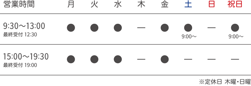 一人一人の症状に合わせてご来院頂けるよう、複数のコースをご用意しております。詳しくはお問い合わせ下さい。